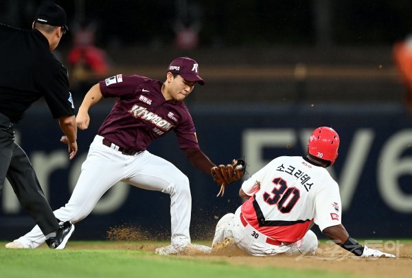 13일 광주 KIA챔피언스필드에서 ‘2022 신한은행 SOL KBO리그’ KIA 타이거즈와 키움 히어로즈의 경기가 열렸다. 2회말 무사 1루에서 키움 김휘집이 2루 도루를 시도하던 KIA 소크라테스를 태그 아웃시키고 있다.