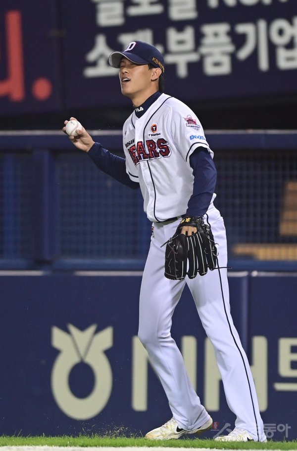 13일 서울 잠실야구장에서 열린 ‘2022 신한은행 SOL KBO리그’ 두산 베어스와 LG 트윈스의 경기에서 4회초 1사 1, 2루 LG의 내야 땅볼 때 두산 유격수의 송구 실책에 박신지가 아쉬워하고 있다.