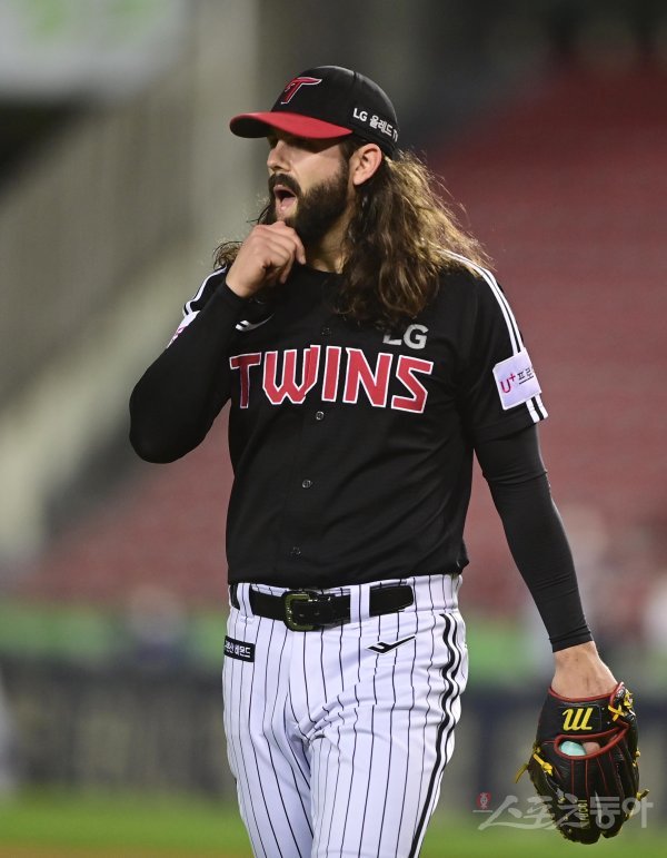 13일 서울 잠실야구장에서 열린 ‘2022 신한은행 SOL KBO리그’ 두산 베어스와 LG 트윈스의 경기에서 2회말 1사 1루 두산에 연속 안타를 허용한 LG 켈리가 아쉬워하고 있다.