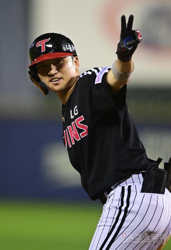 13일 서울 잠실야구장에서 열린 ‘2022 신한은행 SOL KBO리그’ 두산 베어스와 LG 트윈스의 경기에서 3회초 1사 LG 박해민이 중전 3루타를 친 후 더그아웃을 향해 세리머니를 하고 있다.