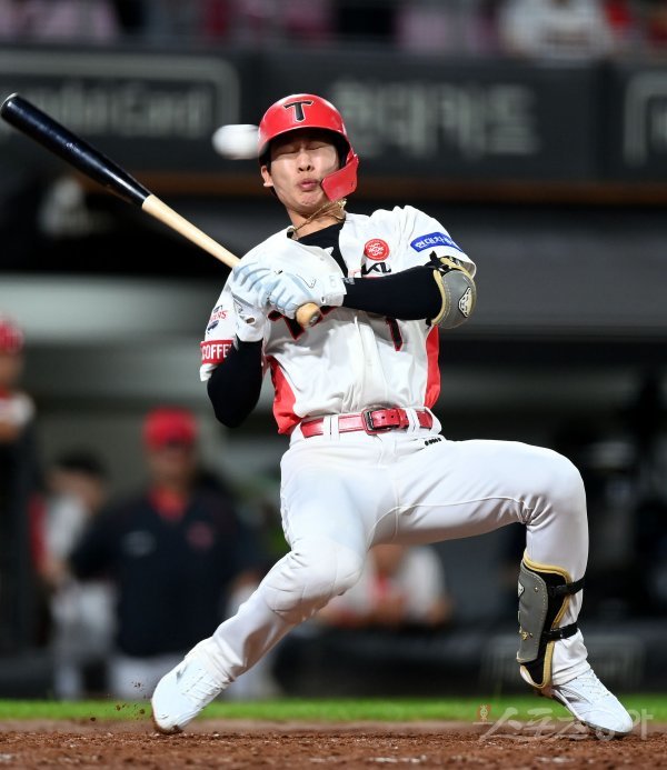 13일 광주 KIA챔피언스필드에서 ‘2022 신한은행 SOL KBO리그’ KIA 타이거즈와 키움 히어로즈의 경기가 열렸다. 5회말 2사 1루에서 KIA 박찬호가 몸쪽 공에 깜짝 놀라고 있다.