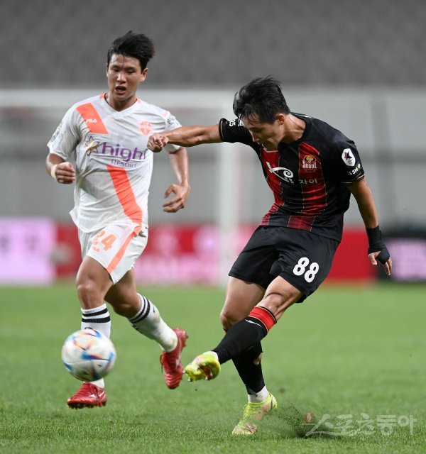 13일 서울월드컵경기장에서 열린 프로축구 ‘하나원큐 K리그1 2022’ FC서울과 강원FC 경기에서 서울 이태석이 패스를 하고 있다.