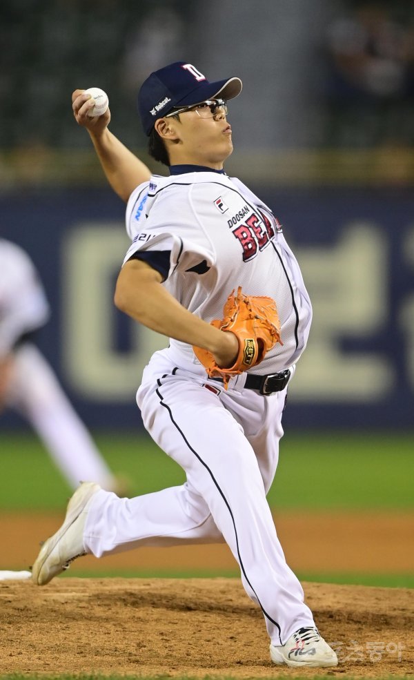 13일 서울 잠실야구장에서 열린 ‘2022 신한은행 SOL KBO리그’ 두산 베어스와 LG 트윈스의 경기에서 6회초 2사 1, 3루 두산 이병헌이 교체로 마운드에 올라 역투하고 있다.