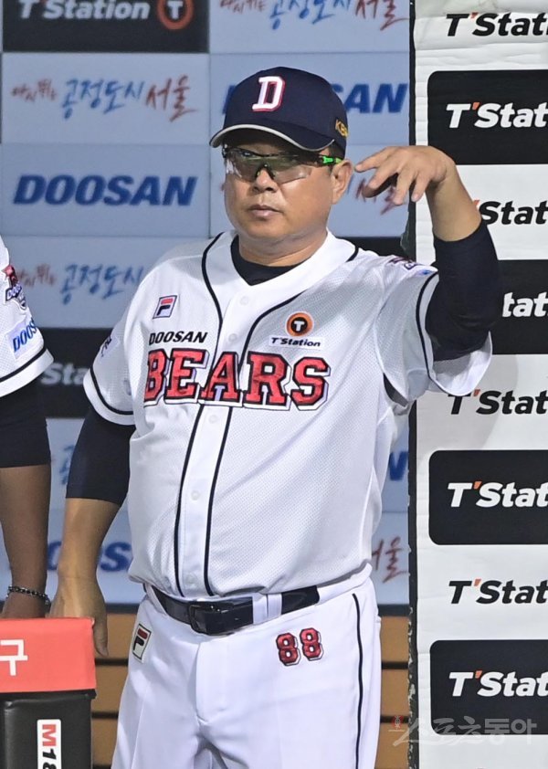 13일 서울 잠실야구장에서 열린 ‘2022 신한은행 SOL KBO리그’ 두산 베어스와 LG 트윈스의 경기에서 6회초 2사 1, 3루 상황에서 두산 김태형 감독이 투수 교체를 지시하고 있다.