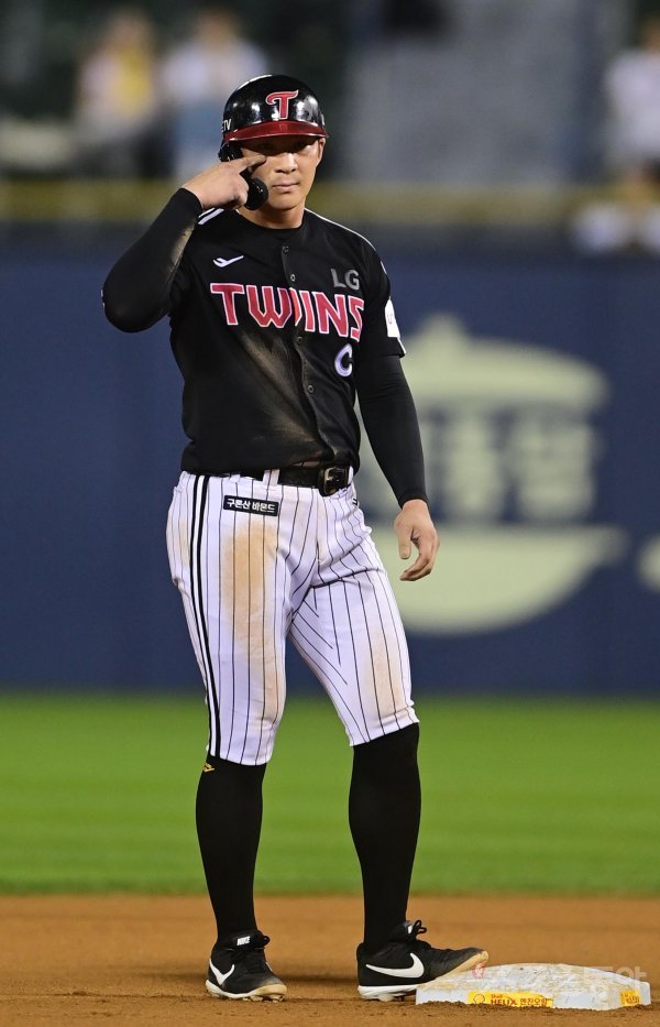 13일 서울 잠실야구장에서 열린 ‘2022 신한은행 SOL KBO리그’ 두산 베어스와 LG 트윈스의 경기에서 6회초 무사 1루 상황에서 LG 오지환이 2루 도루를 성공하며 20-20 달성해 더그아웃을 향해 세리머니하고 있다.