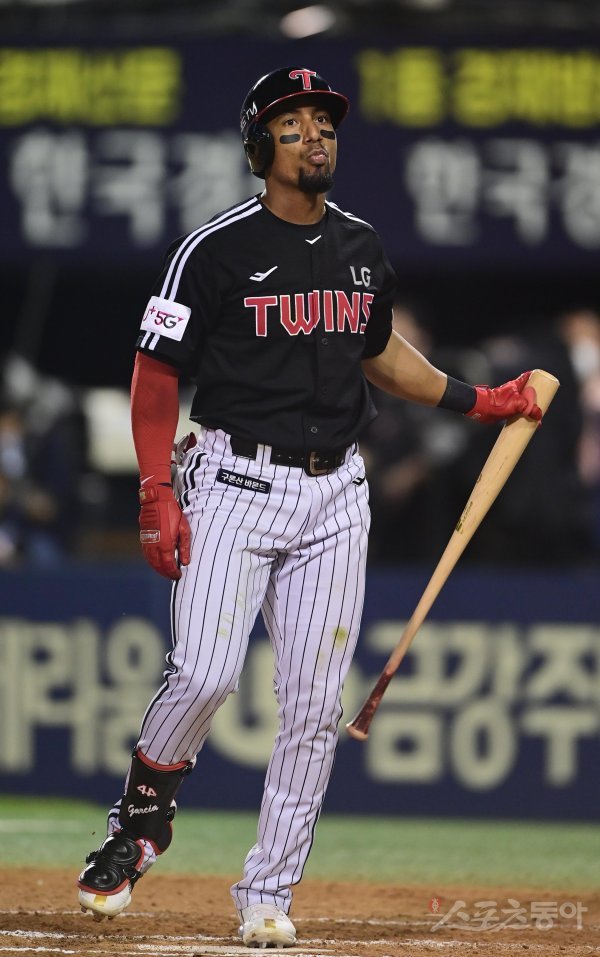 13일 서울 잠실야구장에서 열린 ‘2022 신한은행 SOL KBO리그’ 두산 베어스와 LG 트윈스의 경기에서 6회초 무사 1, 3루 LG 가르시아가 삼진 아웃을 당한 후 아쉬워하고 있다.