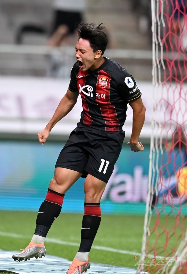 13일 서울월드컵경기장에서 열린 프로축구 ‘하나원큐 K리그1 2022’ FC서울과 강원FC 경기에서 서울 조영욱이 후반 선제골을 성공시킨 후 기뻐하고 있다.