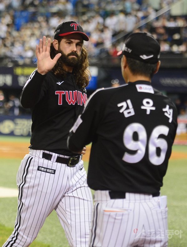 13일 서울 잠실야구장에서 열린 ‘2022 신한은행 SOL KBO리그’ 두산 베어스와 LG 트윈스의 경기에서 6회말 수비를 마친 LG 켈리가 코치와 하이파이브를 하고 있다.