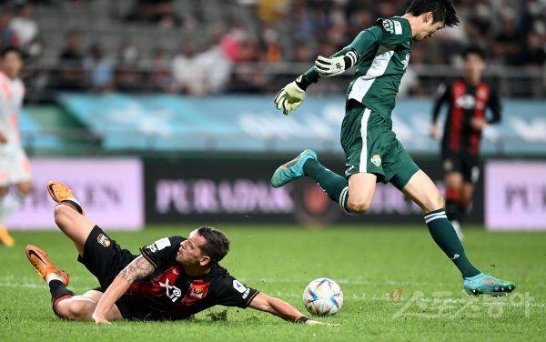 13일 서울월드컵경기장에서 열린 프로축구 ‘하나원큐 K리그1 2022’ FC서울과 강원FC 경기에서 강원 유상훈과 서울 일류첸코가 볼다툼을 하고 있다.