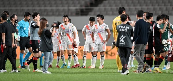 13일 서울월드컵경기장에서 열린 프로축구 ‘하나원큐 K리그1 2022’ FC서울과 강원FC 경기에서 0-1로 패한 강원 선수들이 아쉬워하고 있다.