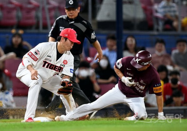 13일 광주 KIA챔피언스필드에서 ‘2022 신한은행 SOL KBO리그’ KIA 타이거즈와 키움 히어로즈의 경기가 열렸다. 9회초 1사 1, 2루에서 키움 이용규가 3루 도루를 성공시키고 있다.