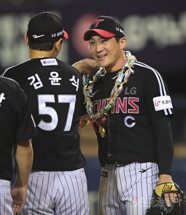 13일 서울 잠실야구장에서 열린 ‘2022 신한은행 SOL KBO리그’ 두산 베어스와 LG 트윈스의 경기에서 5-0으로 승리한 LG 오지환이 20-20 달성 사탕 목걸이를 받고 있다.