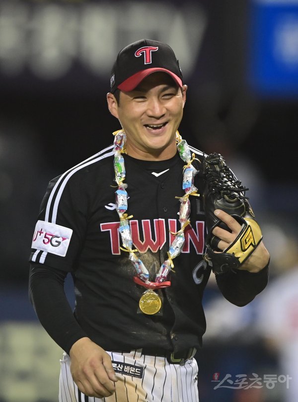 13일 서울 잠실야구장에서 열린 ‘2022 신한은행 SOL KBO리그’ 두산 베어스와 LG 트윈스의 경기에서 5-0으로 승리한 LG 오지환이 20-20 달성 기념 사탕 목걸이를 받은 후 웃고 있다.