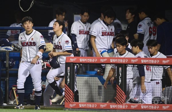 13일 서울 잠실야구장에서 열린 ‘2022 신한은행 SOL KBO리그’ 두산 베어스와 LG 트윈스의 경기에서 0-5로 패한 두산 선수들이 아쉬워하고 있다.