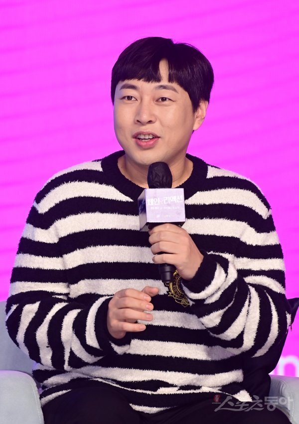 코미디언 이진호가 14일 서울 영등포구 여의도동 콘래드서울에서 열린 쿠팡플레이 예능프로그램 ‘체인리액션’ 제작발표회에서 인사말을 하고 있다.