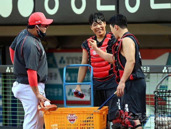 14일 광주 KIA챔피언스필드에서 ‘2022 신한은행 SOL KBO리그’ KIA 타이거즈와 키움 히어로즈의 경기가 열린다. 경기 전 KIA 김선우가 포수 훈련을 마치고 김상훈 코치, 한승택과 이야기를 나누고 있다.