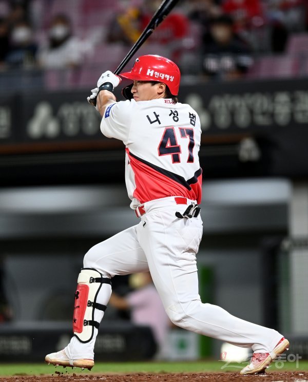 14일 광주 KIA챔피언스필드에서 ‘2022 신한은행 SOL KBO리그’ KIA 타이거즈와 키움 히어로즈의 경기가 열렸다. 4회말 1사 1루에서 KIA 나성범이 안타를 날리고 있다.