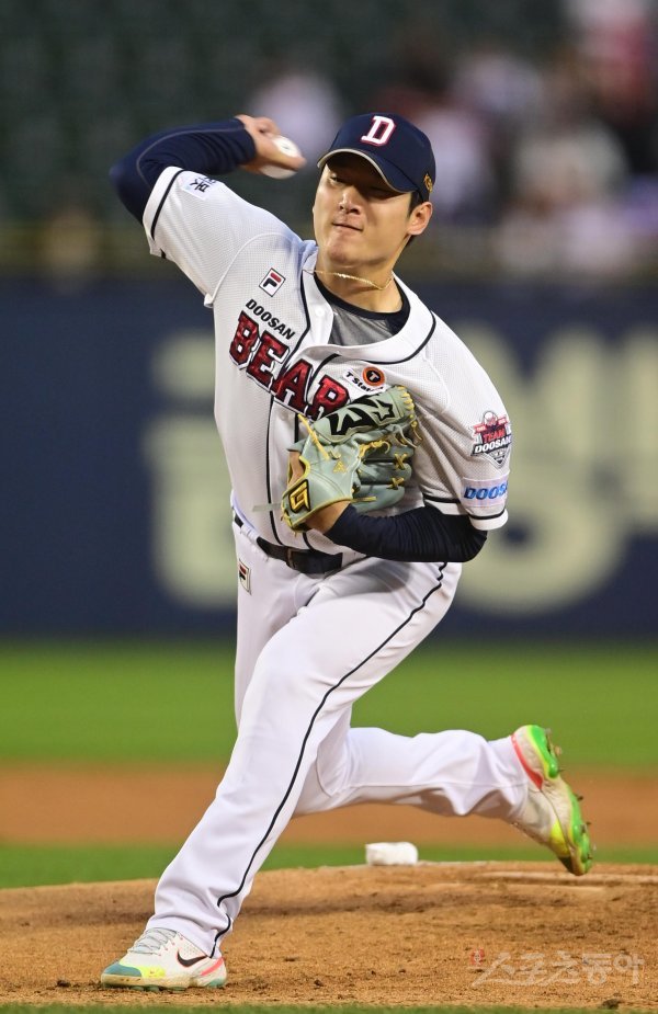 14일 서울 잠실야구장에서 열린 ‘2022 신한은행 SOL KBO리그’ 두산 베어스와 LG 트윈스의 경기에서 선발 투수로 마운드에 오른 두산 곽빈이 역투하고 있다.