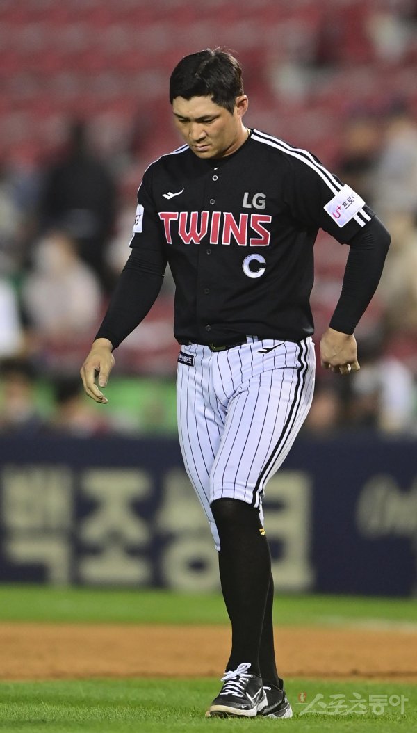 14일 서울 잠실야구장에서 열린 ‘2022 신한은행 SOL KBO리그’ 두산 베어스와 LG 트윈스의 경기에서 4회초 2사 1루 LG 오지환이 2루수 뜬공으로 아웃된 후 아쉬워하고 있다.