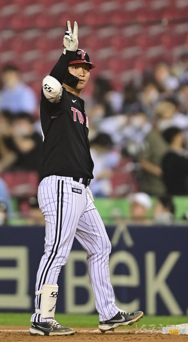 14일 서울 잠실야구장에서 열린 ‘2022 신한은행 SOL KBO리그’ 두산 베어스와 LG 트윈스의 경기에서 2회초 1사 LG 문보경이 우전 안타를 친 후 더그아웃을 향해 세리머니를 하고 있다.