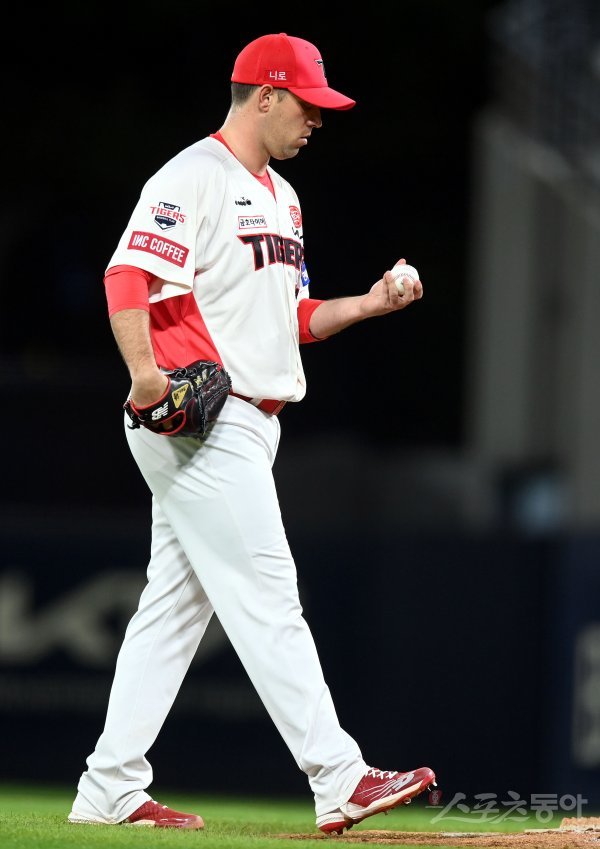 14일 광주 KIA챔피언스필드에서 ‘2022 신한은행 SOL KBO리그’ KIA 타이거즈와 키움 히어로즈의 경기가 열렸다. 7회초 1사에서 안타를 허용한 KIA 선발 놀린이 아쉬워하고 있다.