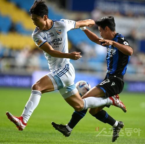 14일 인천축구전용경기장에서 열린 프로축구 ‘하나원큐 K리그1 2022’ 인천 유나이티드와 울산 현대 경기에서 인천 홍시후와 울산 임종은이 볼다툼을 하고 있다.