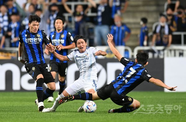 14일 인천축구전용경기장에서 열린 프로축구 ‘하나원큐 K리그1 2022’ 인천 유나이티드와 울산 현대 경기에서 울산 아마노가 인천의 태클에 넘어지고 있다.