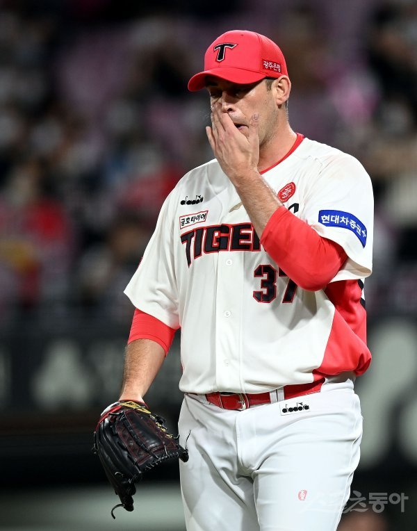 14일 광주 KIA챔피언스필드에서 ‘2022 신한은행 SOL KBO리그’ KIA 타이거즈와 키움 히어로즈의 경기가 열렸다. 8회초 무사 1루에서 번트 때 송구 실책을 범한 KIA 선발 놀린이 아쉬워하고 있다.