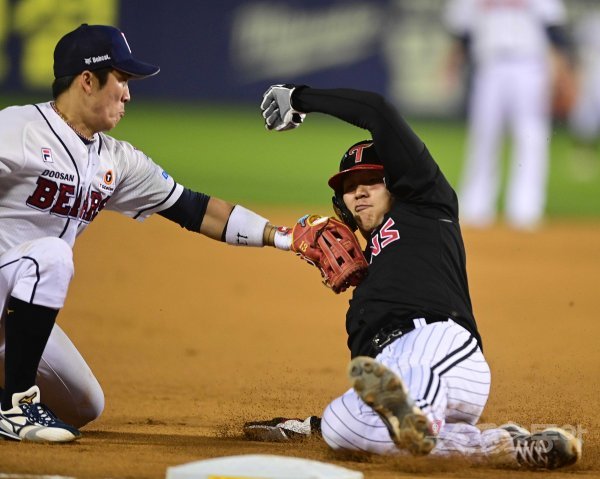 14일 서울 잠실야구장에서 열린 ‘2022 신한은행 SOL KBO리그’ 두산 베어스와 LG 트윈스의 경기에서 5회초 2사 1루 LG의 중전 안타 때 1루주자 문보경이 3루로 파고들었지만 두산 허경민에게 태그 아웃되고 있다.