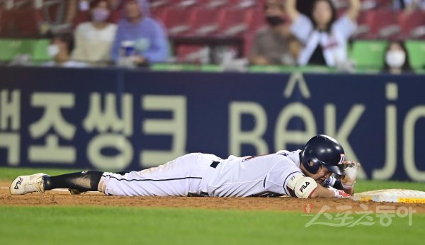 14일 서울 잠실야구장에서 열린 ‘2022 신한은행 SOL KBO리그’ 두산 베어스와 LG 트윈스의 경기에서 5회말 무사 1루 두산 정수빈이 우전 안타를 친 후 2루를 향하다가 1루로 향했지만 태그 아웃됐다.