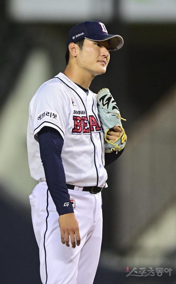 14일 서울 잠실야구장에서 열린 ‘2022 신한은행 SOL KBO리그’ 두산 베어스와 LG 트윈스의 경기에서 7회초 1사 1, 2루 상황에서 두산 곽빈이 마운드를 내려가고 있다.