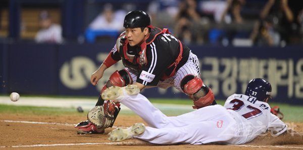 14일 서울 잠실야구장에서 열린 ‘2022 신한은행 SOL KBO리그’ 두산 베어스와 LG 트윈스의 경기에서 6회말 2사 1루 두산의 좌전 2루타 때 LG 유강남이 1루주자에게 득점을 허용하고 있다.