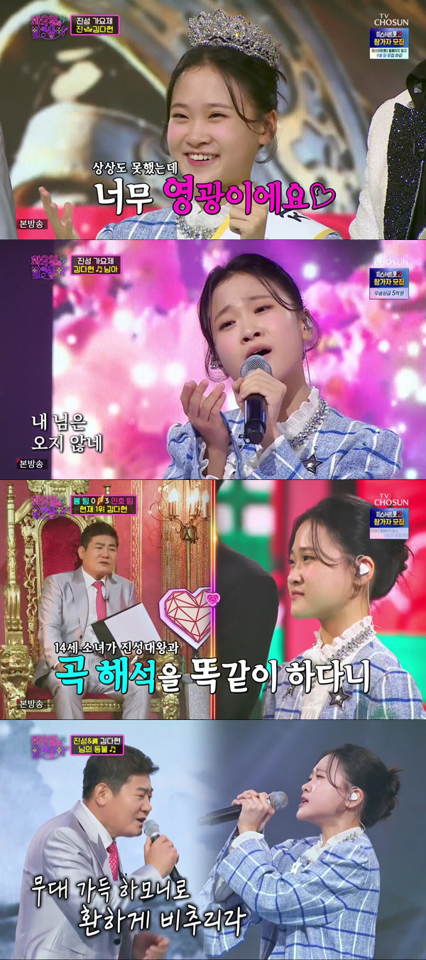 이날 김다현은 구슬프고 애절한 감성으로 객석을 압도하는 가창력을 선보였다. 이에 진성은 “원래 내가 이 곡을 부를 때 분위기를 이렇게 내려고 했다. 14세 소녀가 이렇게 폭넓은 해석력을 보여주어 대단하다”고 극찬을 아끼지 않았다.