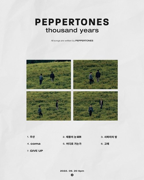 오는 20일 공개되는 페퍼톤스의 정규 7집 \'thousand years’는 페퍼톤스가 4년 4개월 만에 발표하는 정규 앨범이다. 섬세한 위로와 공감의 메시지를 전하는 \'뉴 테라피 밴드’ 아이덴티티는 유지하면서, 그동안 선보이지 않았던 차별화된 음악으로 팬들에게 색다른 음악적 경험을 선사할 예정이다.