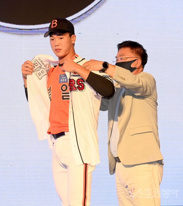 15일 서울 중구 웨스틴 조선호텔에서 열린 ‘2023 KBO 신인 드래프트’에서 두산 베어스 1라운드에 지명된 북일고 최준호가 유니폼을 입고 있다.