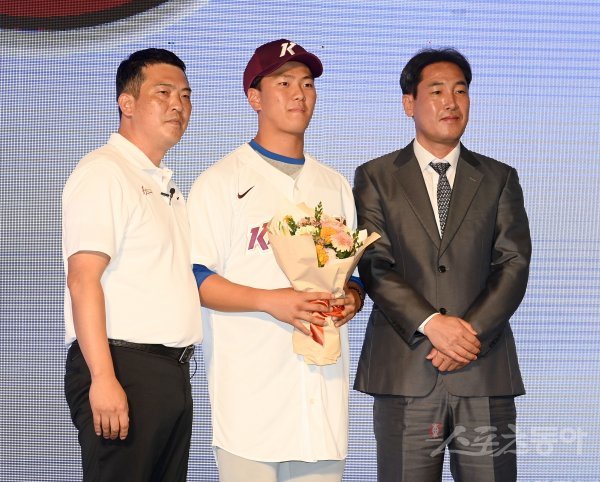 15일 서울 중구 웨스틴 조선호텔에서 열린 ‘2023 KBO 신인 드래프트’에서 키움 히어로즈 1라운드에 지명된 원주고 김건희가 고형욱 단장과 기념촬영을 하고 있다.