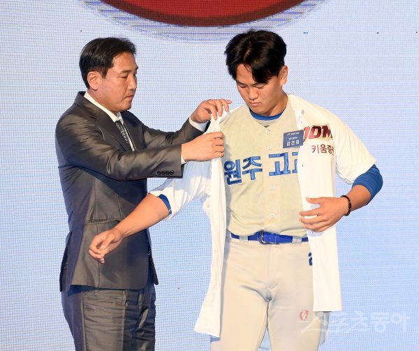 15일 서울 중구 웨스틴 조선호텔에서 열린 ‘2023 KBO 신인 드래프트’에서 키움 히어로즈 1라운드에 지명된 원주고 김건희가 유니폼을 입고 있다.