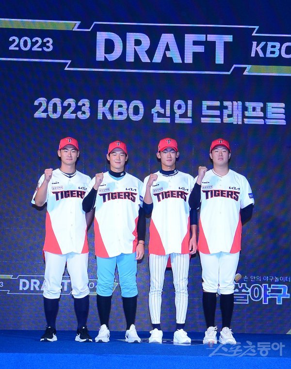 15일 서울 중구 웨스틴 조선호텔에서 열린 ‘2023 KBO 신인 드래프트’에서 KIA 타이거즈에 지명된 선수들이 기념촬영을 하고 있다.