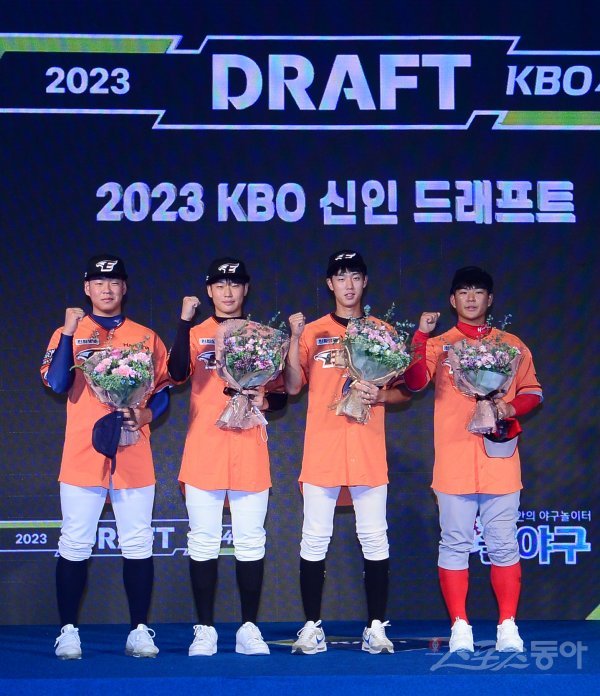 15일 서울 중구 웨스틴 조선호텔에서 열린 ‘2023 KBO 신인 드래프트’에서 한화 이글스에 지명된 선수들이 기념촬영을 하고 있다.