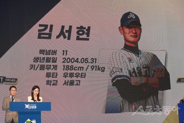 15일 서울 중구 웨스틴 조선호텔에서 열린 ‘2023 KBO 신인 드래프트’에서 한화 이글스 1라운드에 서울고 김서현이 지명되고 있다.