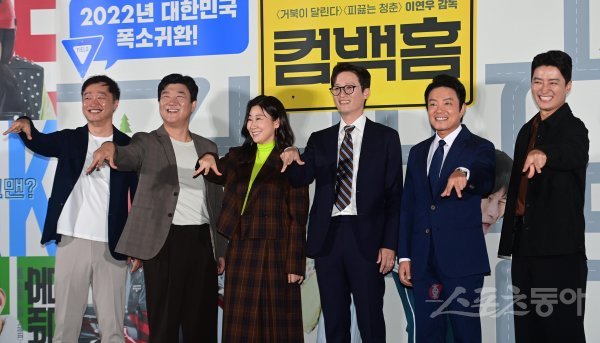 이연우 감독, 배우 황재열, 라미란, 송새벽, 이범수, 인교진이 15일 서울 용산구 CGV용산아이파크몰점에서 열린 영화 ‘컴백홈’ 언론시사회에서 포즈를 취하고 있다.