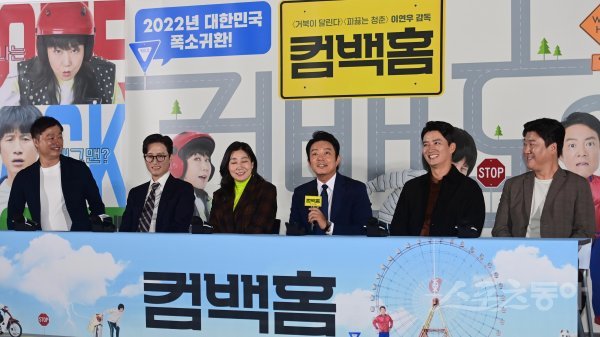 이연우 감독, 배우 송새벽, 라미란, 이범수, 인교진, 황재열이 15일 서울 용산구 CGV용산아이파크몰점에서 열린 영화 ‘컴백홈’ 언론시사회에서 답변에 웃고 있다.