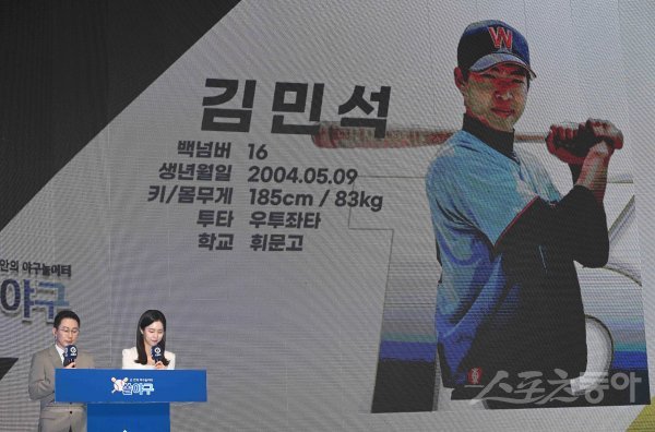15일 서울 중구 웨스틴 조선호텔에서 열린 ‘2023 KBO 신인 드래프트’에서 롯데 자이언츠 1라운드에 휘문고 김민석이 지명되고 있다.
