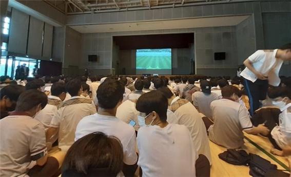 서울 중앙고 축구부가 최근 전국대회를 우승하는 등 부활하고 있다. 지난 6월 강당에 모여 금석배 결승전에 오른 중앙고 축구부를 응원하는 학생들. 사진=손주형