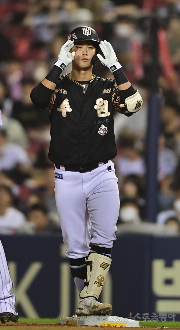 15일 서울 잠실야구장에서 열린 ‘2022 신한은행 SOL KBO리그’ LG 트윈스와 KT 위즈의 경기에서 2회초 1사 1루 KT 배정대가 좌전 안타를 친 후 더그아웃을 향해 세리머니하고 있다.