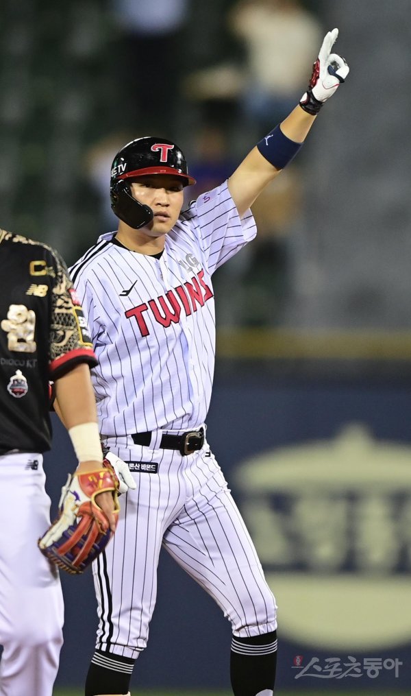 15일 서울 잠실야구장에서 열린 ‘2022 신한은행 SOL KBO리그’ LG 트윈스와 KT 위즈의 경기에서 5회말 2사 만루 LG 박해민이 선제 2타점 좌전 2루타를 친 후 세리머니를 하고 있다.
