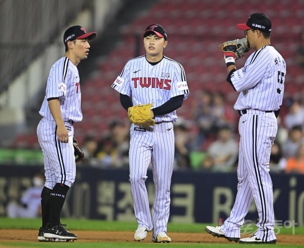 15일 서울 잠실야구장에서 열린 ‘2022 신한은행 SOL KBO리그’ LG 트윈스와 KT 위즈의 경기에서 3회초 무사 KT에 번트 안타를 허용한 LG 김윤식이 서건창, 채은성과 이야기하고 있다.