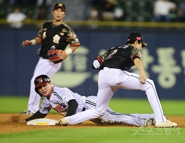 15일 서울 잠실야구장에서 열린 ‘2022 신한은행 SOL KBO리그’ LG 트윈스와 KT 위즈의 경기에서 2회말 1사 1루 상황에서 LG 1루주자 오지환이 도루를 시도했지만 KT 유격수에게 태그 아웃되고 있다.