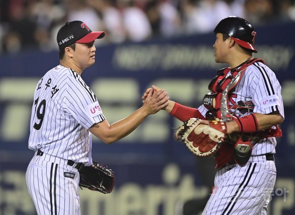 15일 서울 잠실야구장에서 열린 ‘2022 신한은행 SOL KBO리그’ LG 트윈스와 KT 위즈의 경기에서 2-0로 승리한 LG 고우석과 유강남이 기쁨을 나누고 있다.