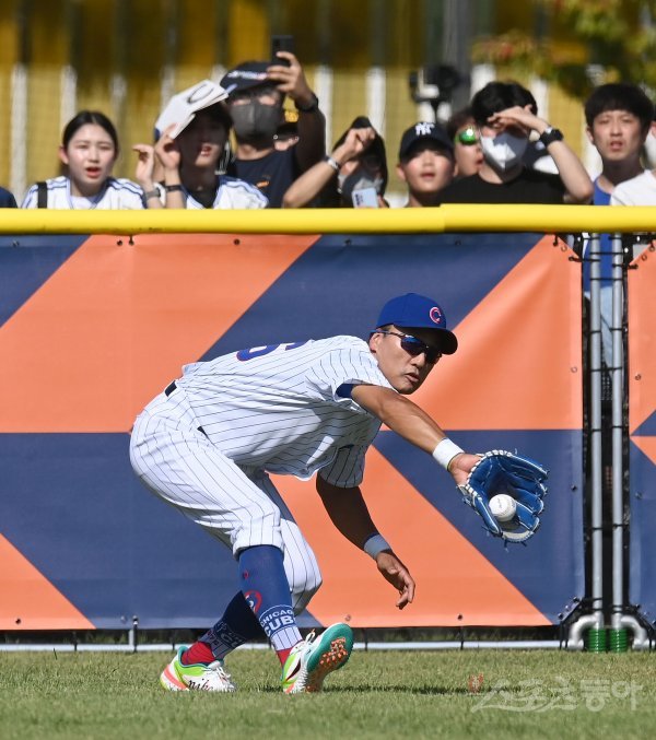 미국 프로야구 메이저리그 베이스볼(MLB)이 주최하는 ‘FTX MLB 홈런더비X 서울’이 17일 인천 파라다이스시티 호텔 컬처파크에서 개최됐다. 시카고 컵스 이승엽이 공을 잡으며 수비 득점에 성공하고 있다.